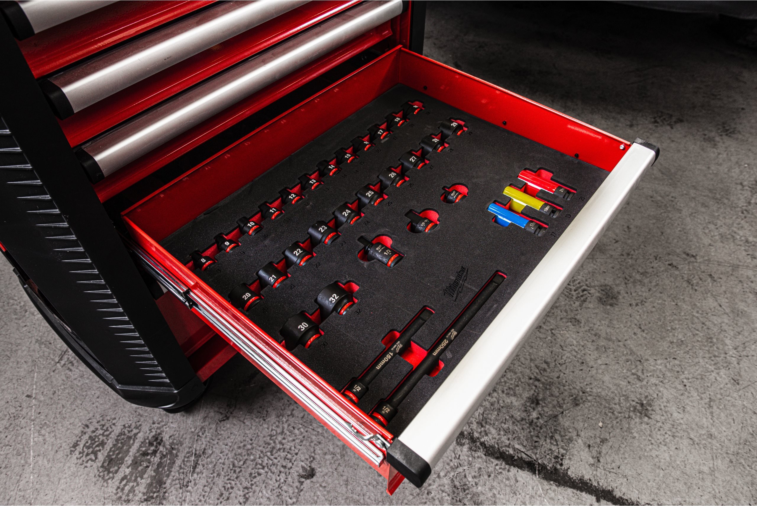 - 5 szuflad wypełnionych niezbędnymi narzędziami potrzebnymi do konserwacji samochodu, starannie umieszczonymi w piankowych wkładkach ułatwiających organizację narzędzi.